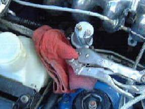 Here is what we see with the cover off. Loosen both hose clamps and slide up the lines a few inches to get them out of the way.The fuel lines will probably be stuck on there fairly tight. Use the rag to pad the pliers jaws and break them loose. This is where the last tiny bit of pressure is released. If you have not depressurized the fuel system as indicated above, you will receive a liberal dousing of pressurized fuel. Do not completely remove the lines, just loosen them up enough so they can easily be removed by hand. Does not matter if the metal filter lines are smashed a little, as we will be throwing the old filter away. Just don’t damage the hoses.