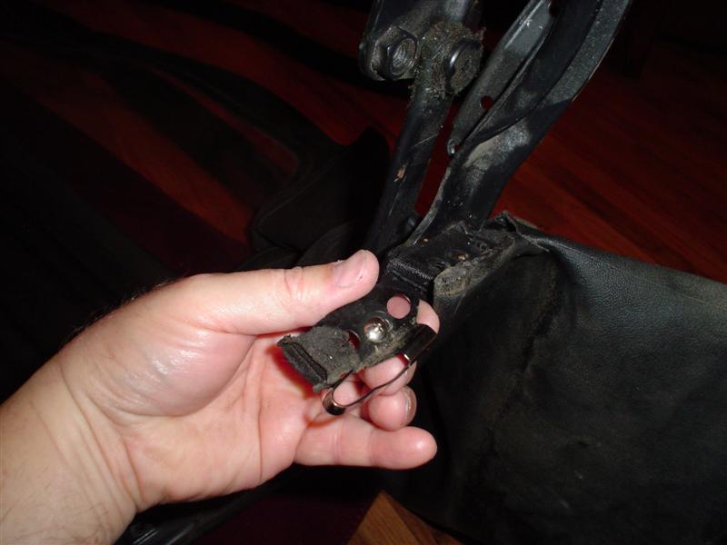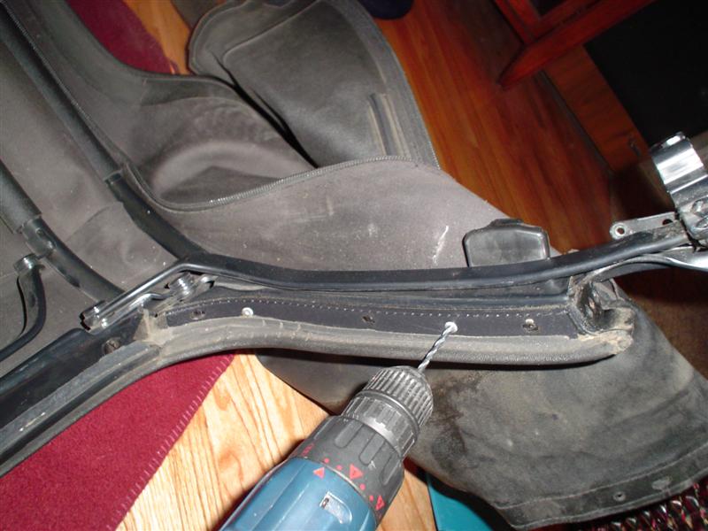 Drill out the rivets and pull the cloth away from the end of the third rubber where the push-type fasteners are.