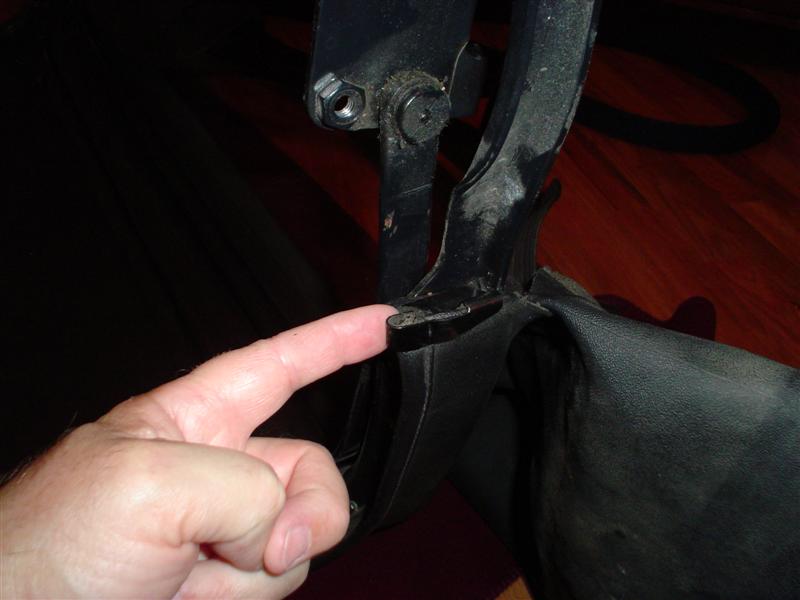 The easiest way to access the 2 push-type fasteners is to remove the 2 rivets holding the cloth behind it.