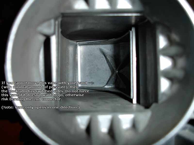 I popped the siliconed cap to expose the circuit and clock spring assembly. At first it wasn't apparent that when I pulled out the black connector part that I had switched which side of connection 1 that the lever hit. This effectively drove connection one into connection 2 enough to bend it. It also prevented the vane from opening.