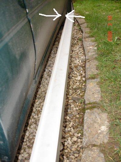 If the job has been done correctly, both sides should match. Note in the picture below, the distance marked at the arrows, is at the seam where the front wing meets the sill (directly below the door hinge). On a Mk 1 (fitted with standard off-set wheels) the gap should be about 35 mm - importantly it should be exactly the same on each side! There should be no significant tyre "run-out" (or bubbles etc.) so this measurement should be a reasonably accurate "quick check" (if it is wrong, go back to stringing or possibly a professional job). As you will see, with a 2 metre straight edge, if the wheel being measured is out by say 1 degree; at 2 metres, this would equate to approximately 30 mm (difference) where the arrows are! Clearly, rear wheel alignment can be checked to within a few minutes of arc, (the same on each side) using this final (rougher) check method!