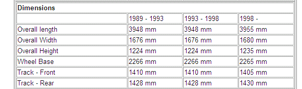 the front and rear track in the table and diagram above.