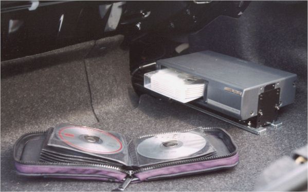These are installation instructions for placing an Alpine S620 horizontally in the small space beside the gas tank and behind the passenger seat in an M2 Miata. Horizontal installation is preferable as the changer is more skip resistant when mounted this way. When finished, the changer is fully accessible from the trunk and there is no lost trunk space. This might work in an M1 if the spare tire has been relocated - I don't know how big the space beside the gas tank is in an M1.