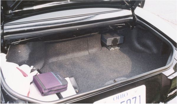 Remove the liner from the section of the trunk you're going to be working in. The piece of the liner you're concerned with extends from the rear passenger side corner of the trunk to about a third of the way across the front wall of the trunk. It's held in place with 2 little plastic fasteners. If you look closely, the head of the fastener is actually in two pieces. The center portion pulls out easily (but it doesn't come all the way out), and releases the whole thing to pull out of the car. If you don't pull the center section first, getting the fastener out is very difficult.