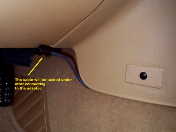 Tuck the cables and the box attached to the Peripheral cable under the dash. There is not much room under there, so removing the panel under the steering wheel will give more room and light -- two Philips head screws hold it on. There is a conveniently located metal bracket under the dash next to the cassette player which is a perfect place to zip tie the box.