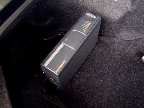 6. Wedge the Changer with attached brackets, etc. onto the metal floor of the trunk right next to the space where the bucket was -- it should fit perfectly (the metal shield probably will need to be pushed /bent back a bit, but it'll fit in the space.)