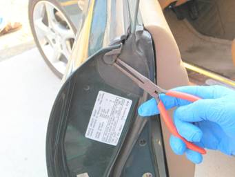 Carefully pull up the outer rubber lip of the molding and locate the rear-most clip. Push in the center ‘tang’ of the clip and it will release from the slot in the door.