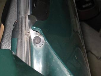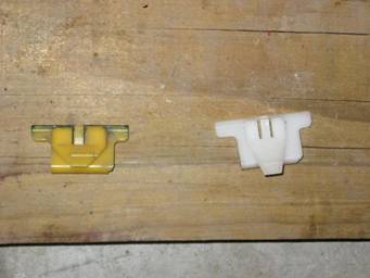 Here’s a shot of the plastic clips that secure the molding to the door. There are 4 white and one yellow clip on each molding. The yellow clip goes in the slot closest to the rear of the door. The clips are attached to the molding and fit into slots in the door.