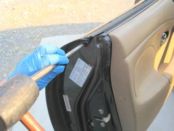 Hold the molding up to the door and make sure all 5 clips line up with the slots in the door. Start at the front and work towards the rear, inserting the clips into the slots. Note that on my ’01, there are 7 slots in the door, but only 5 are used.
