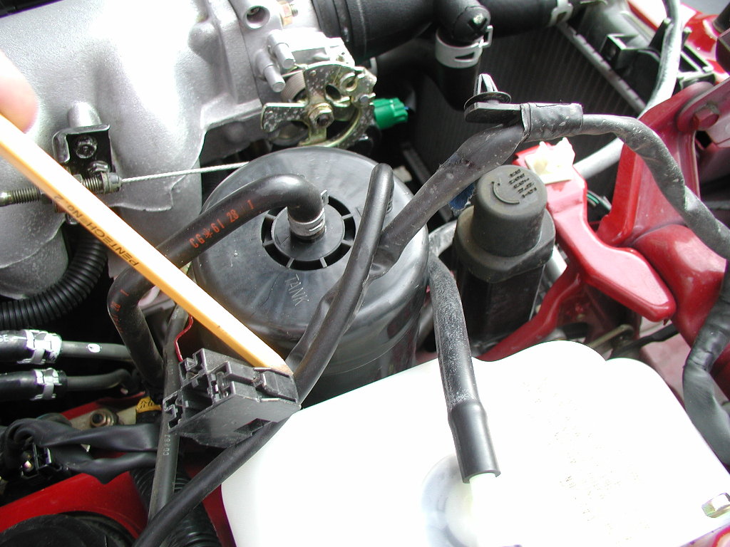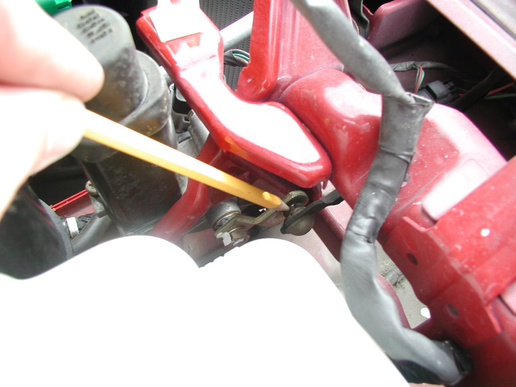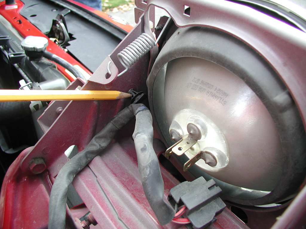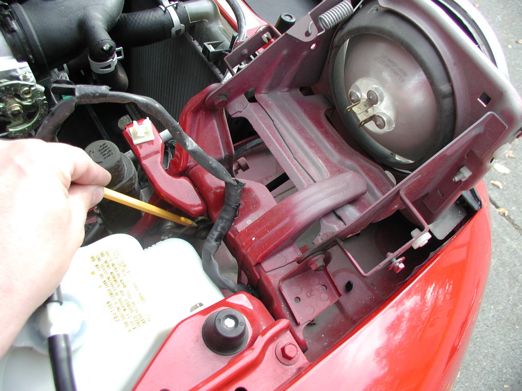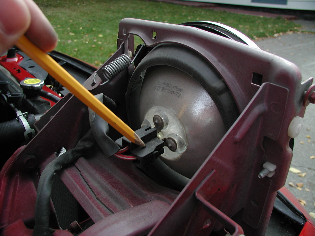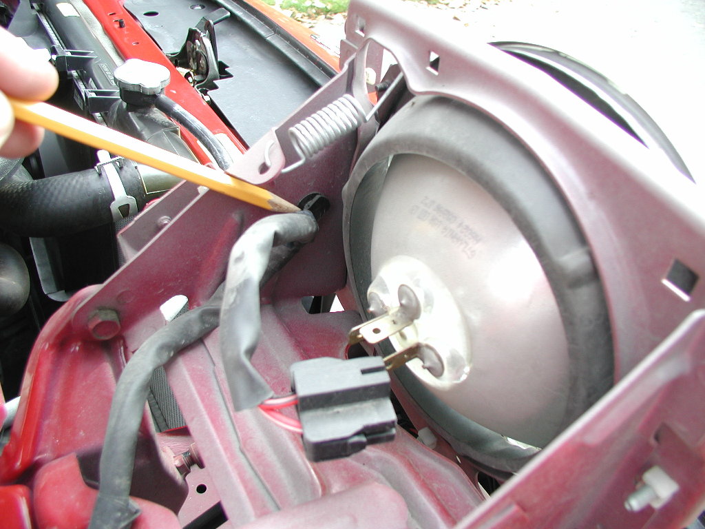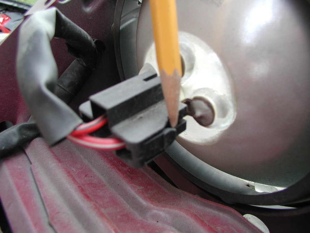 4. A few inches back from the connector, there is another fastener holding the wiring harness to the headlight bucket.