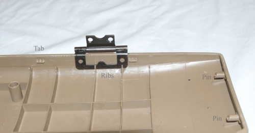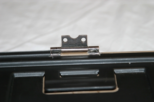Once the glue has set snap the two pieces back together starting with the two tabs at the front fitting these over the two pins at the front of the top. The photo below shows the hinge secured to the top and the two pieces of the center console top back together.