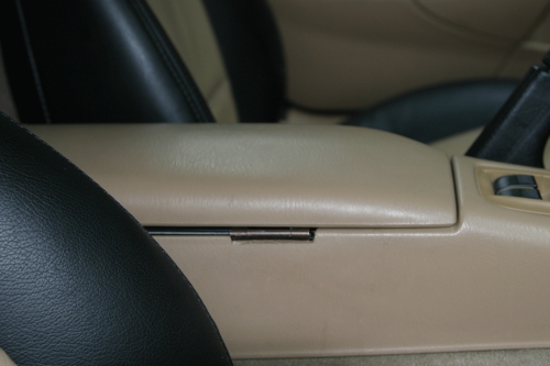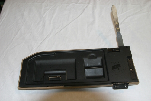 2. Next is the plastic surgery on the hinge lid and center console. Remove the center console lid by removing all the hinge screws including the one on the broken plastic hinge. There are two screws holding the pivot arm (for lack of a better term) attaching it to the console top and you can remove these and leave the pivot are and center console bottom in place. The next step is to remove the bottom section from the center console top. This is held in place by a number of slots in the bottom section of the top and a couple of pins in the front of the console top. Start from the back of the console and gently pry the two sections apart with a table knife of small screw driver working from side to side, back to front.