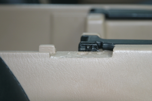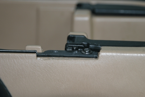 The next step is to mark the cutout for the hinge on the bottom of the center console. I replaced the console top and marked the location of the hinge on the bottom of the center console. I again used the utility knife to remove enough plastic to allow the fitting of the hinge (See photo below)