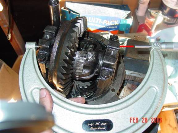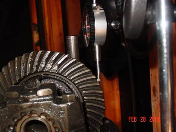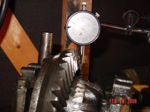 Now move the ring gear back and forth with your hand (remember the pinion shaft Must be locked) and measure the movement of the ring gear with the dial indicator. This is the backlash.