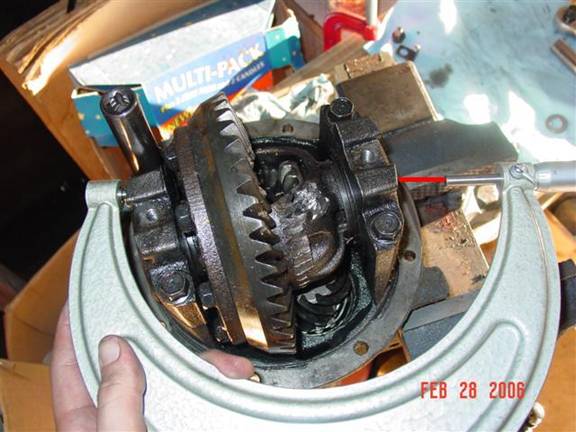 Now take your 7-8inch (6-7 inch if 1.6) micrometer and place it across the flats at a diagonal like shown. (I didn’t have a set of 6-7 inch micrometers for the 1.6 differential but the lines should give you an idea what I’m talking about.)