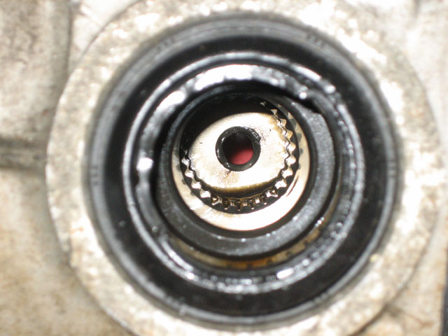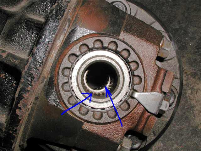 We know this is a 1.8 liter because it has a pinion damper and stub shafts with four ears, each with a stud in it, but no extra ears in between. It is open, as also circled, are the spider gears. Later 1.8 liter halfshafts, after mid '95 are one piece - without separate stub shafts. So this is an early 1.8 liter differential.