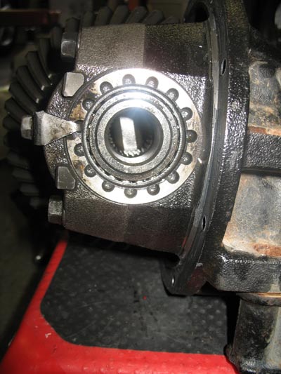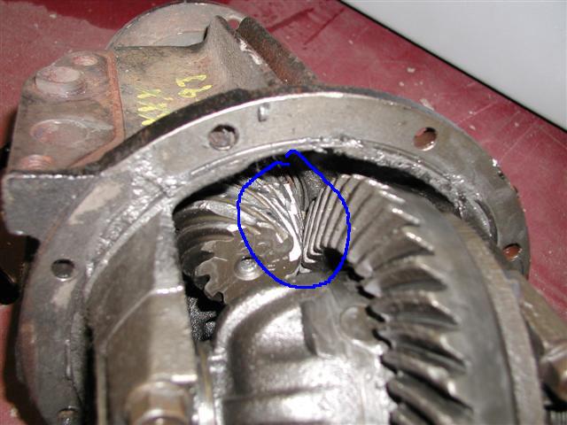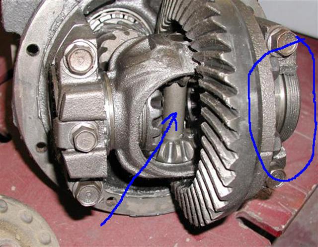 Arrow points to spider gear shaft on this open 1.6 liter differential. On the right side of the picture, circle indicates broken bearing cap. Refer to image below.