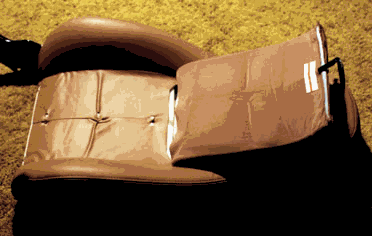 The back of he padded flap is covered with a thin scrim cloth. This scrim cloth is open where the flap attaches to the seat and is sewn at the free end. In the middle along the sewn end, make a small slit in the scrim just below the stitch line with your knife. The slit should be about ¾" long. Just long enough for the plastic connector on the end of the seat heater pad to fit through.
