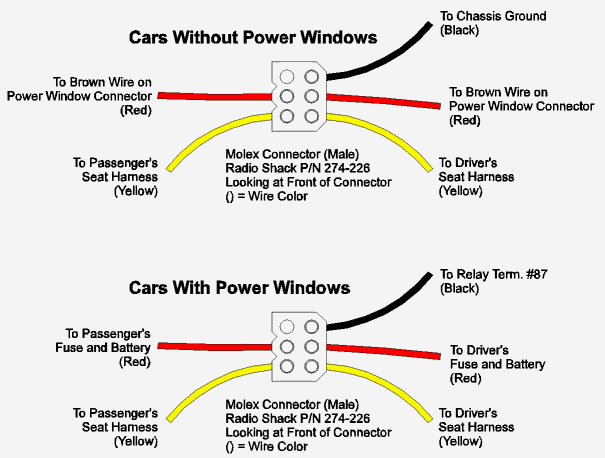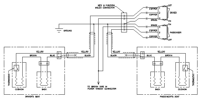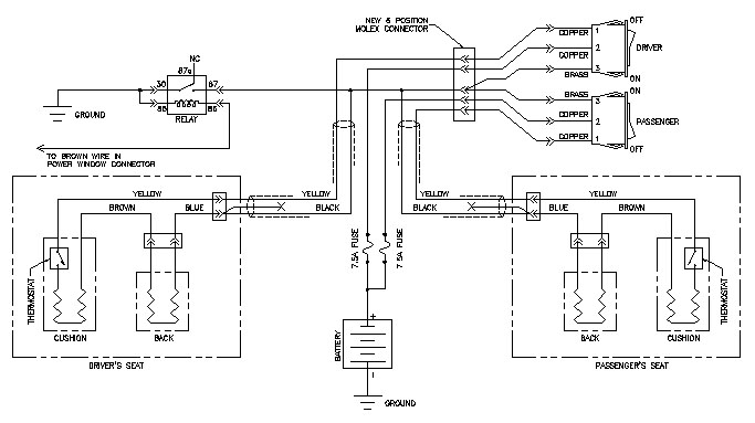 Use solderless taps or a solder connection to attach two 12" pieces of wire to the brown wire going to the power window connector. If you are installing only one seat heater, replace the current Power Window fuse in the Miata with the 7.5A fuse that came with the kit. If you are heating both seats, you will need to install a 15A fuse in the PW position.