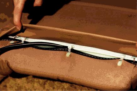 The next step is to reattach the cover to the cushion. Notice in the foam cushion where the hog rings were attached the little circular cutouts with a wire running though them. These are the places where we will use wire ties to reattach the seat. Dont worry, there is enough padding on the seat that you will not notice the heads of the wire ties.