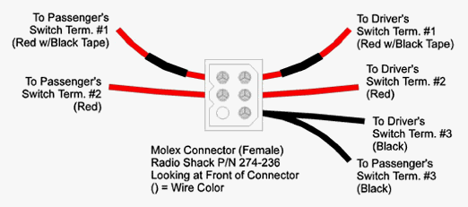 The first thing to do is to make a little wiring harness for our console. Start with four 6" long pieces of red wire, and two 6" pieces of black wire. You can cut these from the ends of the power harness provided with the heaters. Put a small piece of black tape on two of the red wires. Now crimp and/or solder a ¼" female spade connector onto one end of each of the wires. On the other end, crimp and/or solder one of the contacts from the female Molex connector (Radio Shack P/N 274-236). Attach both black wires to the same contact (you will end up with one Molex contact left over). Push the contacts into the connector shell, according to the following diagram, from the back until they click: