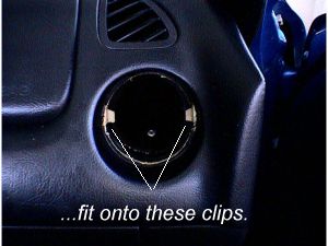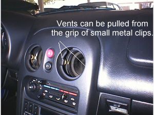 So, after a little detective work after yanking the one vent, I found that there are only two plastic clips holding the vent in that are part of the dash. These clips are at 3 and 9 o'clock and snap into indentations on the collar of the vent when inserted. There are now obviously two ways to remove the vent in a nonviolent/destructive manner. The first method would be to rotate the vent either clockwise or counter about 20 degrees and the vent would just slide out(the clips would no longer be resting in indentations). I didn't test this method, as I had no way to grip the vent structure to turn it, but I am sure someone could. (Editor's note: we don't think this method will work and will most likely result in damage to the vent and/or dash.)