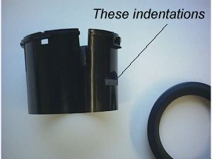 Using a small flat headed screwdriver, push each plastic notch back, whilst pulling the rim away from the cylinder. This takes a bit of effort to achieve as there are about 4 of these, and are quite tightly attached to the cylinder. After at least 2 of these are out of the rectangular holes, it is now easier to pull the rim clean off. Once the rim is out, the eyeball vent can be pulled out of the cylinder.