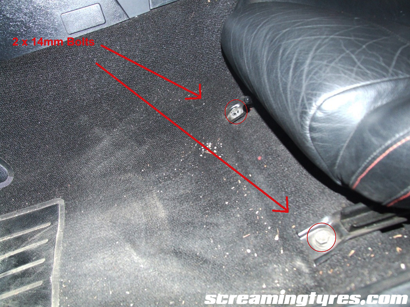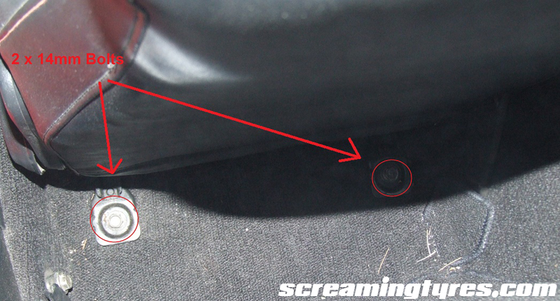 Step one: Remove the seat. There are 4 14mm bolts that hold it to the floor. Slide the seat all the way to the back to access the front ones.