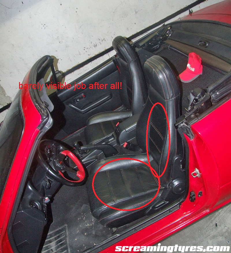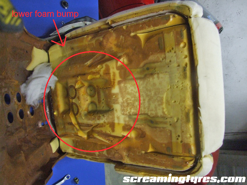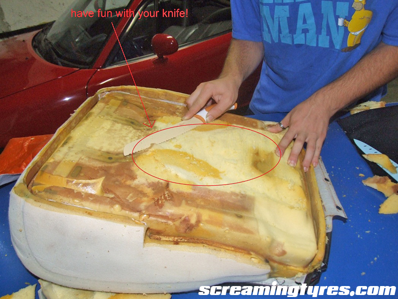 Identify the lower bump and mercilessly cut it away with your knife. You may also shape the seat from above but the fabric may look loose afterwards. That’s why we went for the “hidden” option. The seats were reupholstered by the previous owner in this case. We had to remove the extra padding added by him. What a shame!