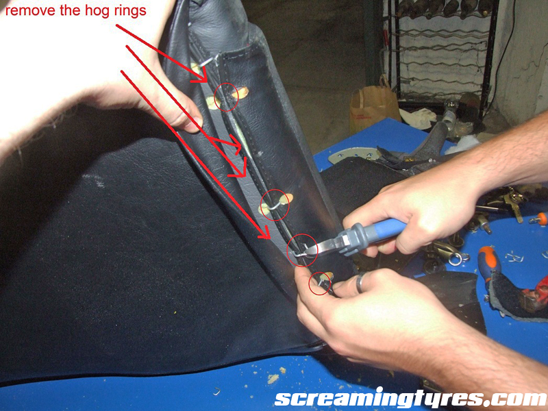 Step three: the lower cushion. Take the pliers out and and remove all the hog rings. Wear some form eye protection, they tend to jump!