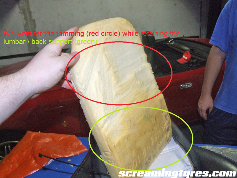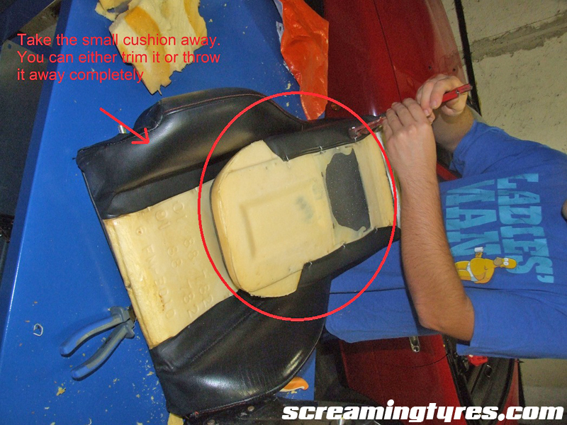 Remove the small back cushion from the seat. As the picture says you can either throw it away completely or carve it to retain some form of lumbar support: