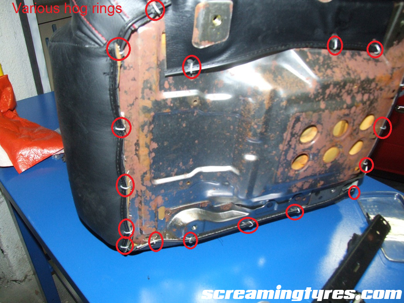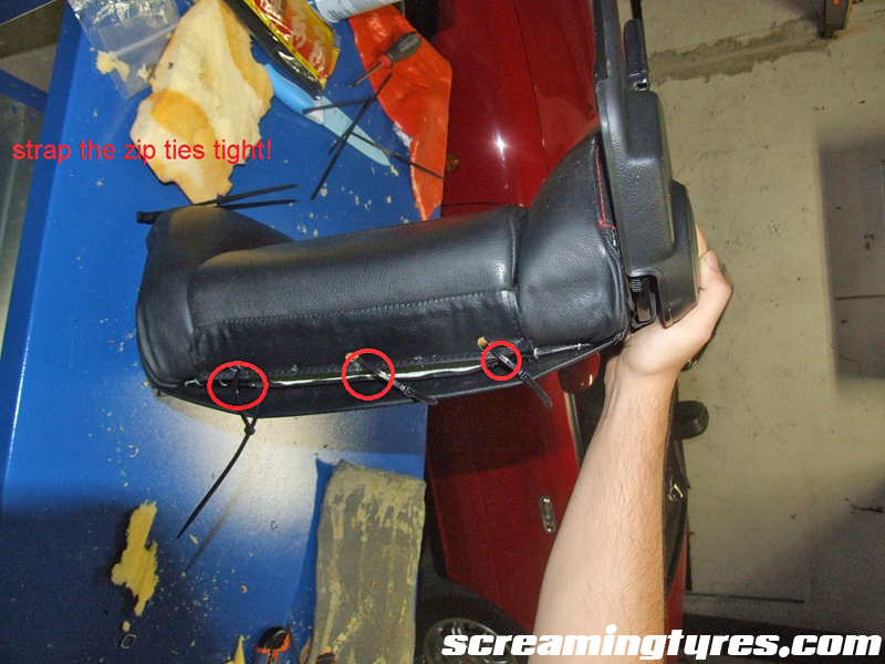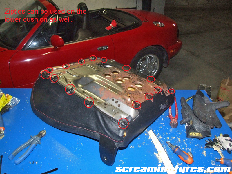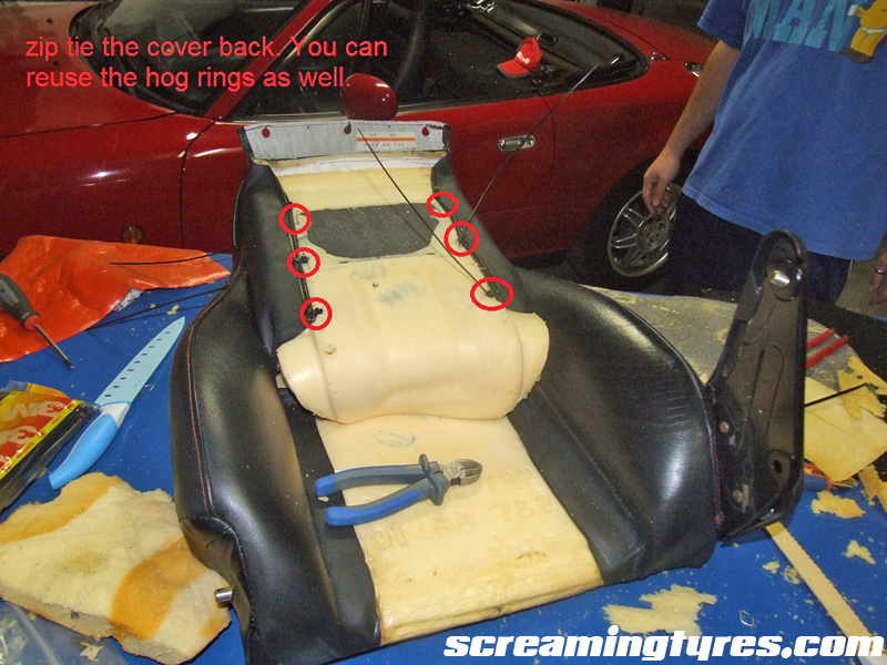 Step five: re upholstering the seat. This part is pretty much straightforward. Proceed in reverse order: put the upper cushion back in and replace the hog rings with heavy duty zip ties. Using new hog rings is useless and way slower. It’s your choice!