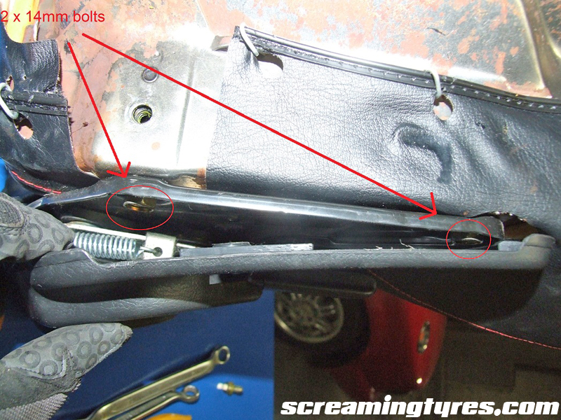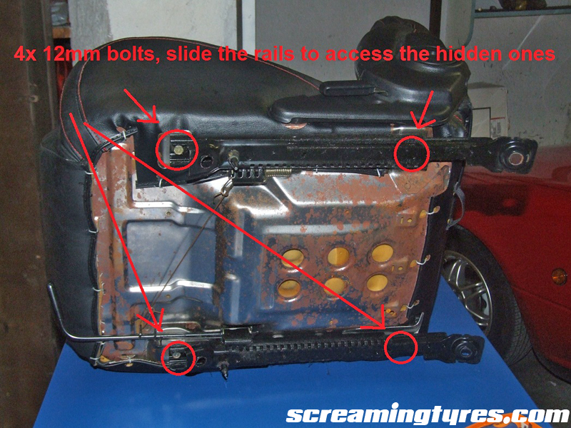 Step two: Remove the sliders from the seat. The rails are held in place by 4 12mm bolts. You have to slide the rails in order to access the rear ones.