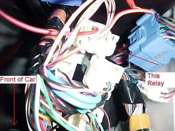 First, disconnect the battery for safety reasons. Remove the lower dash cover, it is held on by two Philips screws. I will point out that on my 2001 (should be the same for other 2001s, I dont know about other years) the fog lamp relay is NOT located under the hood (like the 99 model). I spent a long, long time looking for it. It was moved to inside the cabin, under the dash, grouped with the flasher and some other relays. It is the relay farthest to the rear of the car in the group (I will try to get a good picture of it sometime). To remove it from the bracket, pull it straight down. It will come lose eventually. With the relay removed, you want to locate the red/yellow stripe wire. You need to either remove this wire from the connector with a jewelers screwdriver (what I did) or cut it. If you remove it, take your time, it will come out. If you cut it, leave enough room to attach a new wire (3 or 4 inches). Also, tape up the loose end of the wire and tuck it out of the way. With the wire removed/cut, you need to run a new wire to something +12v when the ignition is on. I chose the radio power wire, for convenience. It also turns off when the car is starting, to give you a little extra juice while you crank up the engine. If you removed the wire, you need to find a wire terminal similar to the one you removed. I happened to have one. It is a small female blade type terminal, they sell them at most auto parts stores or Radio Shack. Crimp/solder the terminal to your +12v IGN wire, and stuff it in the connector where the old red/yellow wire was. If you cut the wire, simply solder/crimp connect your +12v IGN wire to the wire going to the relay that you cut. With this done, time to check your progress. Reconnect the battery, and turn the key until your radio turns on (if you used the radio wire). Your fog lights should be on. So far so good, but the fog lamp switch doesnt do anything now. On to part two! Dont forget to disconnect your battery after testing.