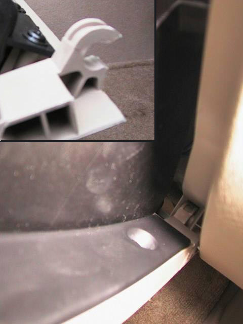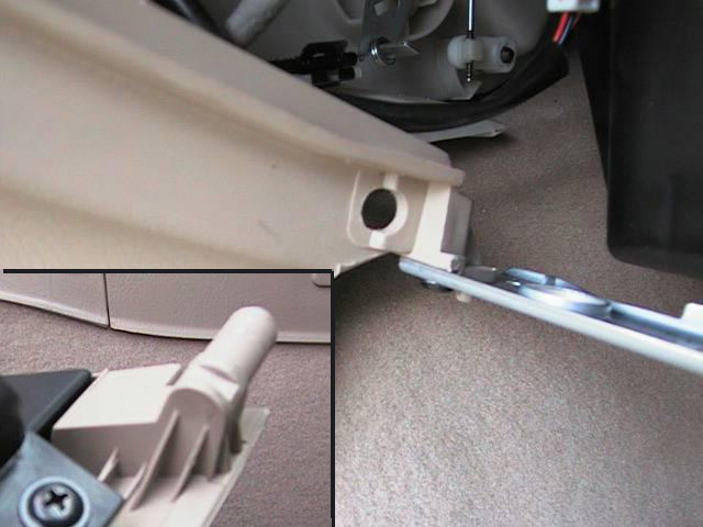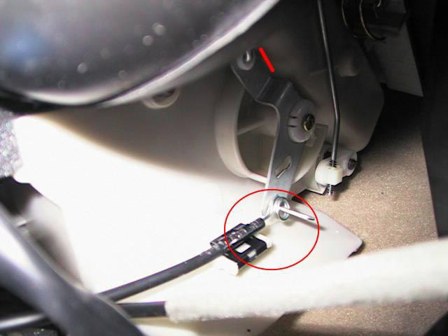 Just to the left of the opening you are looking at under the dash -- and just behind the edge of the console -- are two 1cm X 1cm holes. I attached a straightened out paper clip (then hooks formed on each end) from the top hole to the other end of the #`106 spring. See diagram.