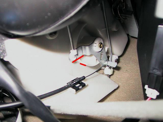 How to install: Sorry I can't provide photos, but the install is not too hard to visualize from written instructions. First remove the glove box: open the box and pull firmly on the bottom right side: it pops out (and back in easily later on). After you pull the glove box all the way out and set it way out of the way, look just behind the center column on the dash, about 20-30 cm in front of the AC controls (i.e., under the dash center). You will see a black cable, like a bicycle brake cable with a hard steel wire coming out of it. A loop of this spring steel wire is attached or pushed over a lever arm. On the other end of the lever arm is the hot/cold selection door. To verify you are looking at the right thing, turn the hot/cold selector knob. The spring steel wire should move in and out (fore and aft in relation to the car).