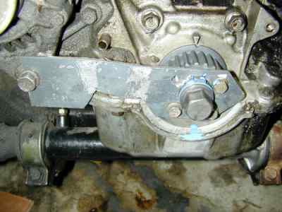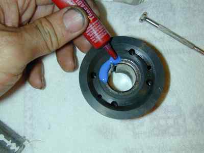 Here is the pulley locked down with the home made fixture. Note that because I was sloppy in making it, only three of the four hold-down bolts fit the fixture, The bolt has been tightened to 85 foot pounds with an accurate torque wrench. Excess loctite is dripping off the assembly. The loctite 242 that I used has a long setup time, but the loctite 660 will start to set within minutes after assembly. I worked quickly. It took less than 15 minutes to mount the pulley, bolt on the fixture, spin on the crank bolt and torque the assembly. It's very important to allow 24 hours for curing. Since I was in no rush, I gave it 48 hours before I did any further work on the engine. |