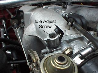 Set up your timing light and diagnostics jumper as described in "Checking Timing" above. With the jumper installed, your idle should be about 850 RPM. If it is incorrect, adjust it with the idle air bypass screw located on the throttle body. The screw is under a black rubber cap. Clockwise lowers the idle, CCW raises it.