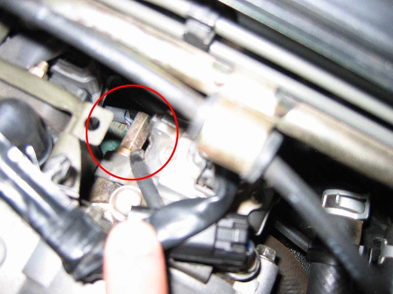 On the rear face of the head you will find a round unit with a multiplug on it. This is the sensor. There is one bolt with a twelve mm head on it that is the hold-down. If you were sitting in the driver's seat looking at the back of the head, the bolt is at about five o'clock. Don't forget to jump the TEN and GND pins in the diagnostic connector (close-up view) before setting.
