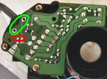 The picture below shows where the 2 resistors are added: a 10 kOhm resistor (I used an SMD resistor, but a normal resistor works just as well,) at the red circle, and a a 100 kOhm potentiometer or wires leading to an external pot at the green circle.