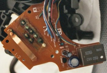 5) Remove the plastic cover (it is clipped at 3 positions (above), and carefully lift the wiper circuit board from its clip (below):