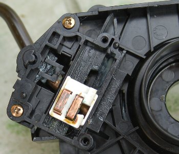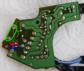 6) Twist the wiper circuit board so that you get access to the solder side. Watch out to not shift the white plastic piece with the contacts that is operated by the wiper stalk: