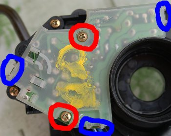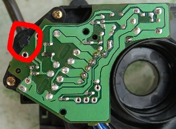 4) Use a stubby Phillips screwdriver (there is no space for a normal screwdriver) to remove the two screws that hold the plastic cover and the wiper control circuit (you can't see the screws, so you pretty much have to feel them, or use a small pocket mirror or cosmetic mirror.) See the red circles in the picture below for the location of the screws.