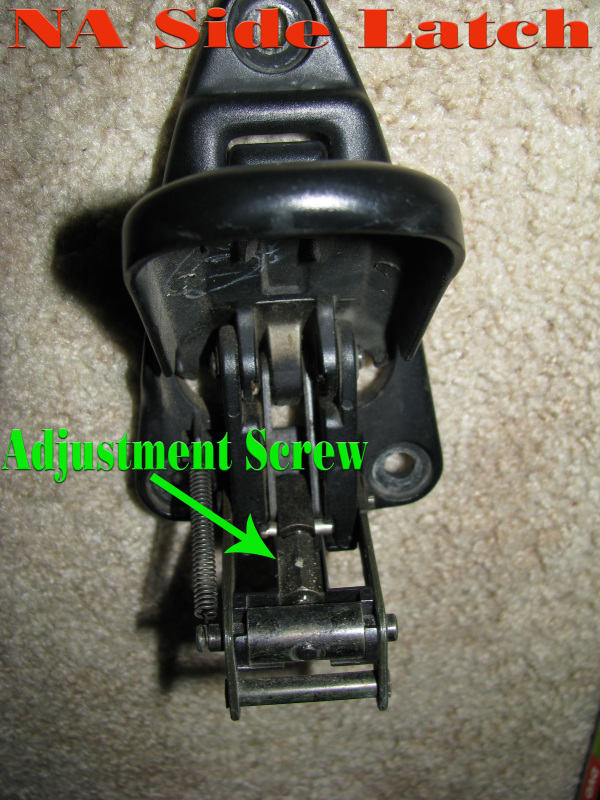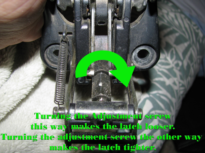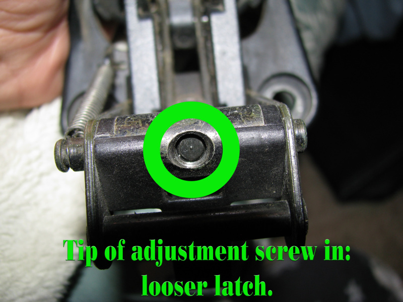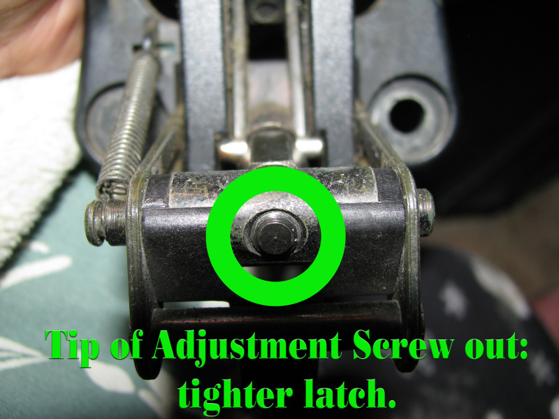 3. Turn the adjustment screw in the desired direction (see pic). One full turn is more than enough. I may take you a couple tries to get the latch to latch on perfectly. An ideal latch will have just a little bit of give to it just before it clicks shut.