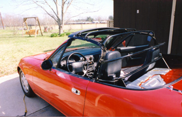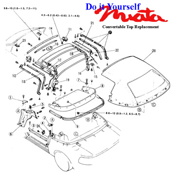 Before you start dissasembling your car, remember that I'm just a shade tree mechanic. I play with tools for fun when I'm not working with computer networks. This article is based on the two (yes, just 2) Miata convertable tops I have changed. From talking to people, these instructions should work for any Mazda MX-5 Miata from 1990-1997 with the factory convertable top, but both of the cars I worked on were 1990 US Models.