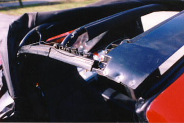 Once the carpet is out you will have exposed the 10 mm nuts that hold the back of the top to the car. There are also two more of those plastic clips that hold the rain rail to the car at each end, but you will probably have to lower the top to get to them. I removed all of the nuts, and took out the three metal bars that they secure. If you are reusing the rain rail, be gentle. It is very fragile and you can easily tear then ends off. Next you need to unlatch the top and open it halfway.
