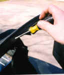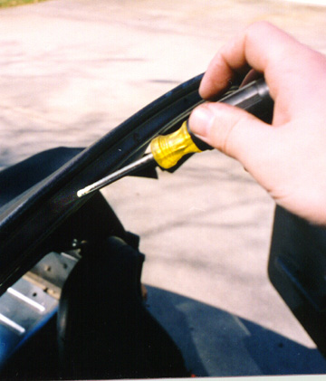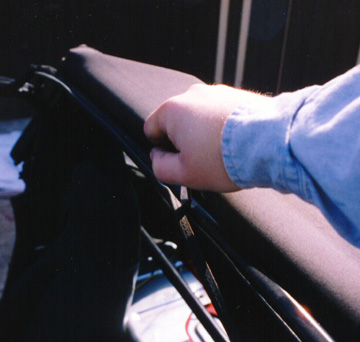 Notice that my old top had separated from the top bow, so I could just peel it back. Use a plain flat blade screwdriver to pry the gap in the top bows wide enough to remove the old cloth. It has to be wide enough to insert the cloth from the new top, so go ahead and do the whole thing now. The rearmost bow right above the window also uses velcro as an attachment. Once this is free, you should be able to lift the old top fabric off of the car.