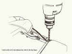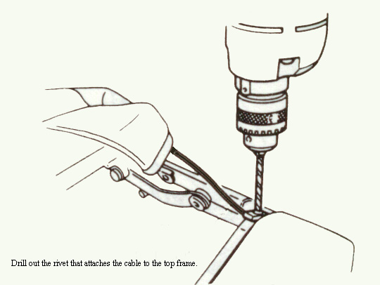 Now all thats left holding the top on is a few rivets. One rivet on each side holds a cable to the top frame. The cable runs through the top fabric. I think I used a 1/4" drill bit to get the rivets out, but I'm sure anything kind of close will work. Other than the rivet that holds the cable in, there are 2 or 3 on each side that hold the top fabric to the frame.