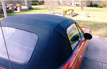 The first time I changed my top it was kind of unplanned, and for various reasons I chose to order a top from J.C. Whitney. It cost about $200 (US), which was about $150 less than any other Miata top I had seen for sale at the time. I have absolutely no complaints about the top quality or fit. It was definitely worth $200 and I would recomend it to anyone who absolutely needs a replacement top but is on a tight budget like I was when I owned two Miatas. I didn't care for the material too much, it had a high gloss to it and looked to be closer to a dark grey rather than black. The other big issue was that of the rain rail.
