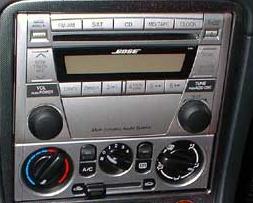 Description: This system includes a double-DIN head unit with an integrated AM/FM tuner and single-disc slot-loading CD player or in-dash 6-disc changer. The head unit has speed-sensitive volume control with three settings for top up and three more for top down. The head unit includes 4x25 (peak) Watt amplifiers, two of which are used for the door tweeters. Two other channels send speaker-level audio to a pair of single-channel 100-Watt amplifiers behind the unit for the special Bose door speakers. Mazda rates it as a "225-Watt" system. The double-DIN units are "modular", meaning that an integrated casette deck or MiniDisc player can be added to the bottom and the single-disc CD player can be swapped out for a 6-CD changer or MP3-CD player on top.